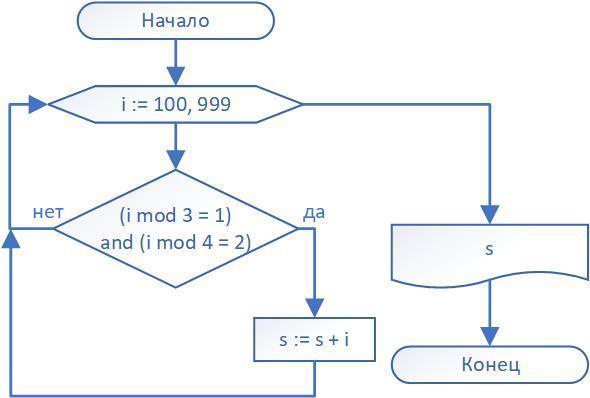 Нужно нарисовать цикловую блок-схему для решения этой задачи на Паскале :найти сумму всех трёхзначных чисел ,которые когда делим на 3 остаётся 1 остаток ,а когда делим на 4 остаётся 2 остатка .