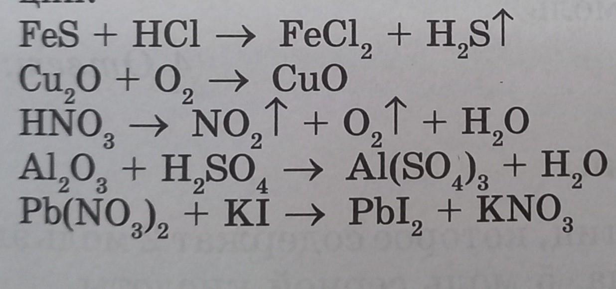 С 1. Расставьте коэффициенты в уравнениях. Определите количество вещества (в моль) участвующих и образующихся веществ. Определите типы реак- FeS + HCI → FeCl, + H,ST Cu,0 +0, Cuo HNO, NOT +0,1 + но H,0 Alo + HSo, Al(SO), +Н,0 Pb(NO), + Ki - Pb, + KNO 3