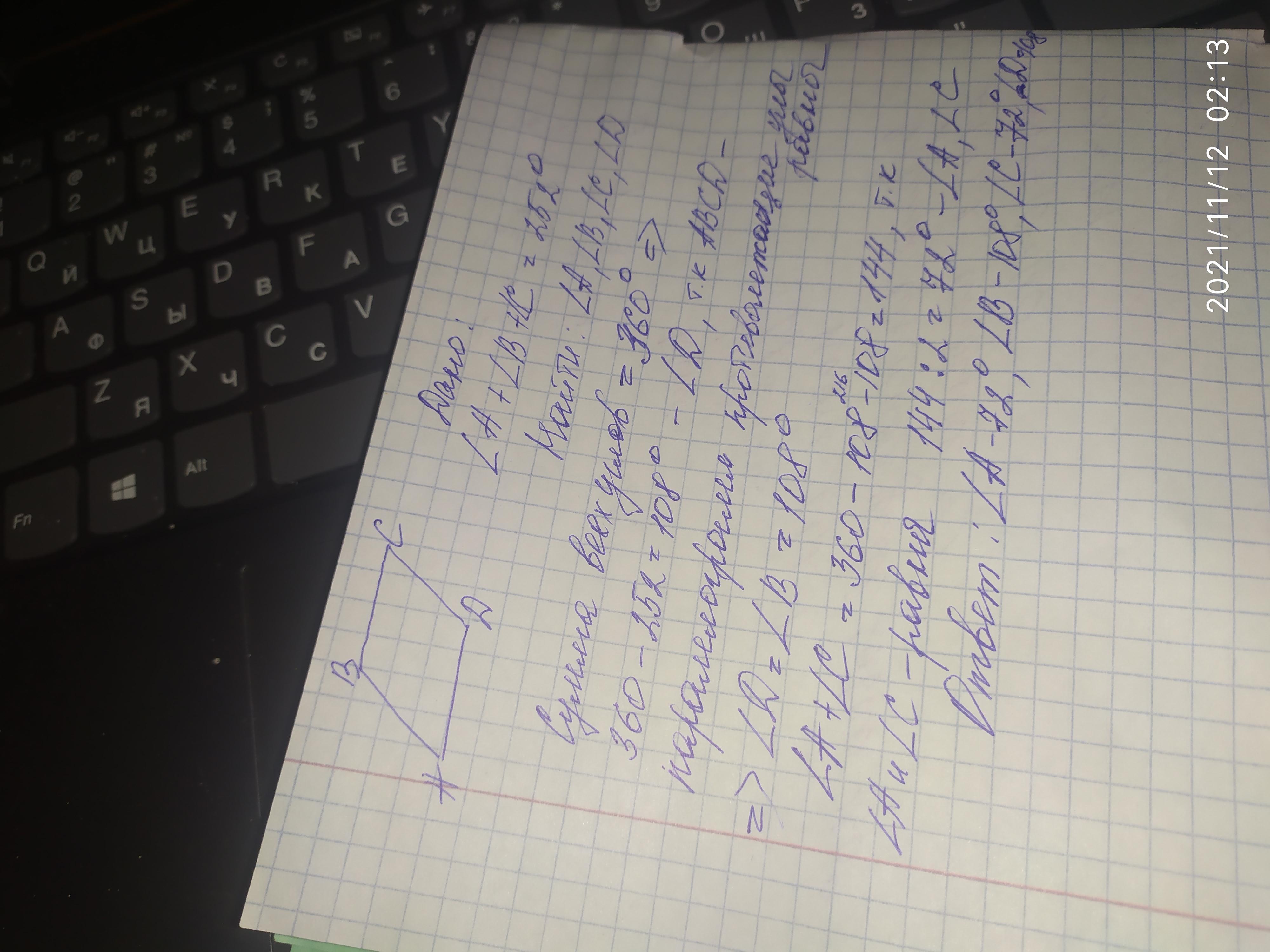 360-252=108 первый угол. второй, противолежащий равен так же 108