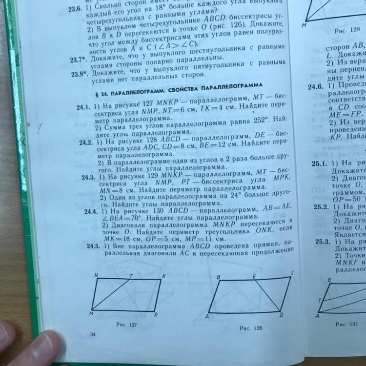 Накрест лежащие углы параллелограмм равны, из этого следует, что один угол мы можем найти зная сумму трех углов, и этот угол будет равен второму противолежащему углу. А отняв сумму двух найденных равных углов от 360 найдем сумму двух равных других углов. Делим эту сумму на 2 и получаем градусную меру двух равных углов.