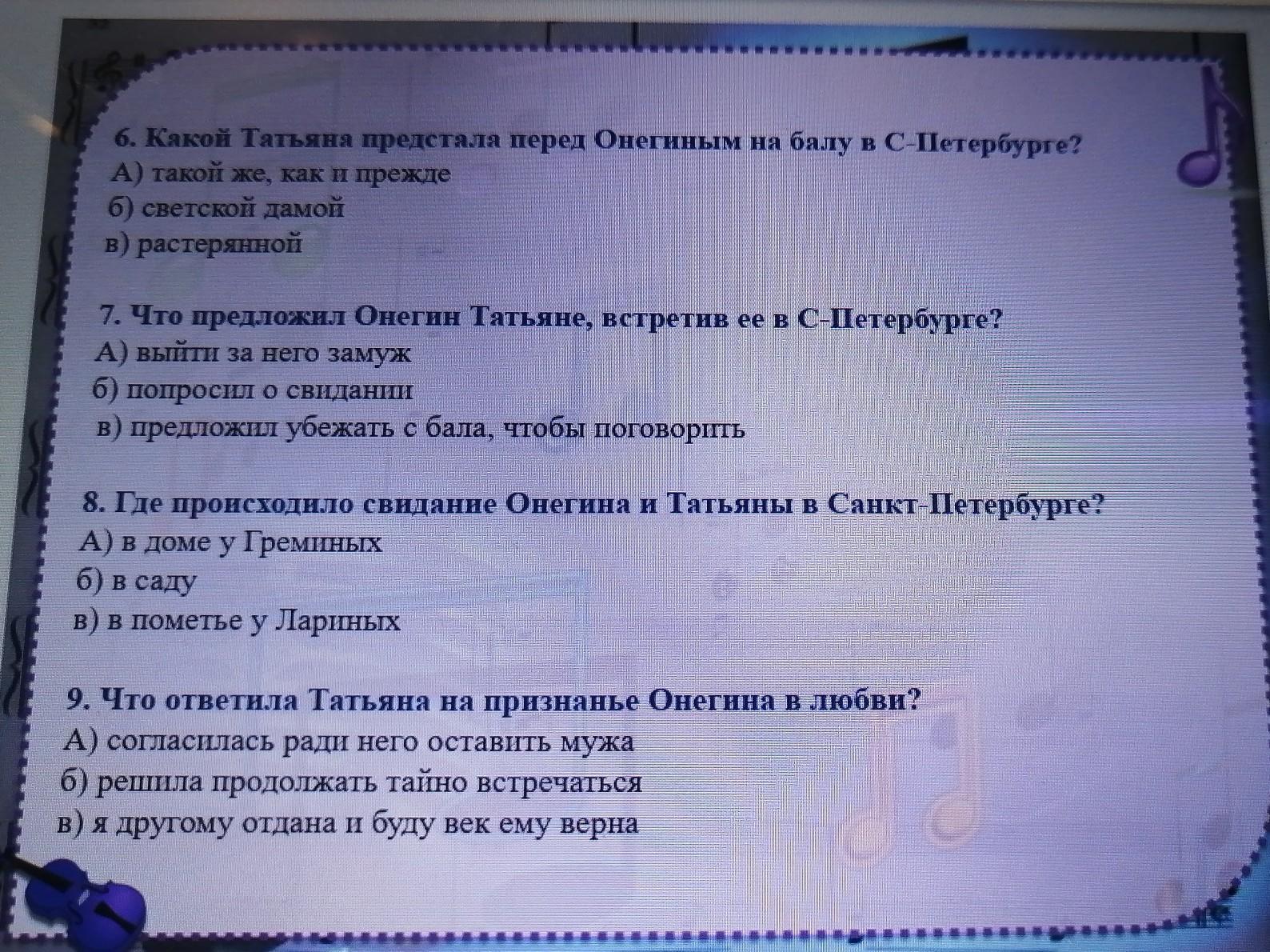 6. Какой Татьяна предстала перед Онегиным на балу в С-Петербурге? А) такой же, как и прежде б) светской дамой в) растерянной 7. Что предложил Онегин Татьяне, встретив ее в С-Петербурге? A) выйти за него замуж б) попросил о свидании в) предложил убежать с бала, чтобы поговорить 8. Где происходило свидание Онегина и Татьяны в Санкт-Петербурге? А) в доме у Греминых б) в саду в) в пoмeтье у Лариных 9. Что ответила Татьяна на признанье Онегина в любви? А) согласилась ради него оставить мужа б) решила продолжать тайно встречаться в) я другому отдана и буду век ему верна