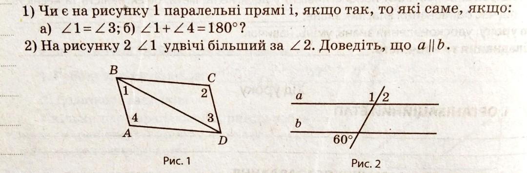 1) Чи є на рисунку 1 паралельні прямі і, якщо так, то які саме