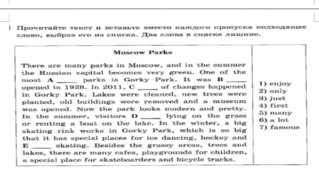 Прочитайте текст и вместо каждого пропуска Вставьте подходящее слово выбрав его из списка. Два слова лишние. Moscow parks