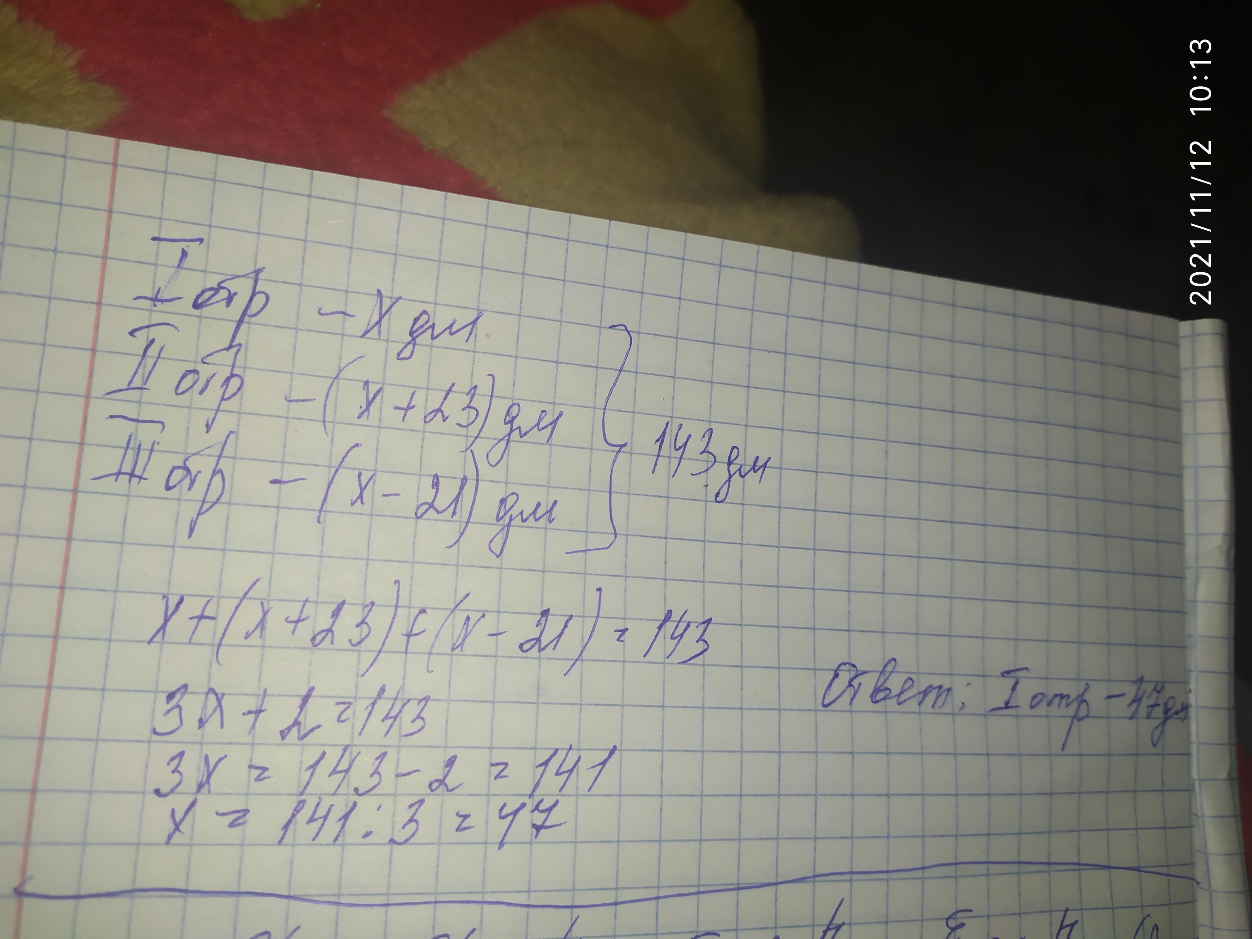 6. Сумма длин трех отрезков равна 143 дм. Найдите длину х первого от- резка, если он на 23 дм короче второго отрезка, но длиннее третьего на 21 дм.
