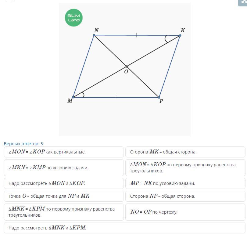 Дано: MP = NK, ∠MKN = ∠KMP. Выбери