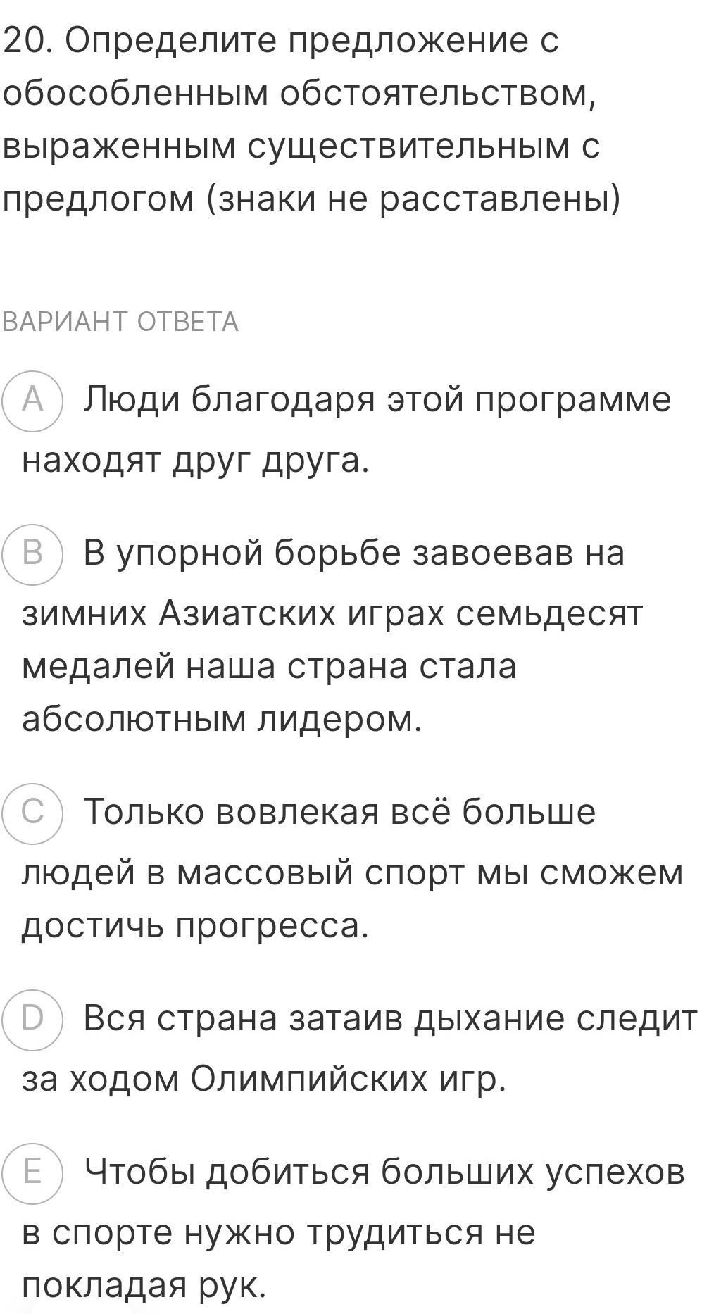 20. Определите предложение с обособленным обстоятельством, выраженным существительным с предлогом (знаки не расставлены) ВАРИАНТ ОТВЕТА А) Люди благодаря этой программе находят друг друга. B В упорной борьбе завоевав на Зимних Азиатских играх семьдесят медалей наша страна стала абсолютным лидером. Только вовлекая всё больше людей в массовый спорт мы сможем достичь прогресса. D Вся страна затаив дыхание следит за ходом Олимпийских игр. E Чтобы добиться больших успехов в спорте нужно трудиться не покладая рук.