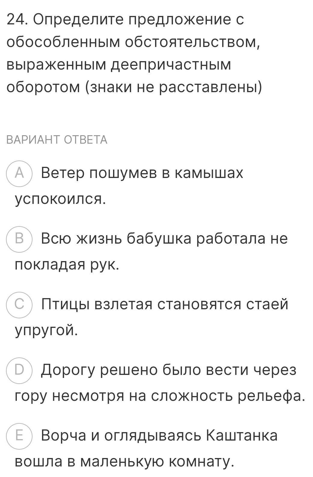 24. Определите предложение с обособленным обстоятельством, выраженным деепричастным оборотом (знаки не расставлены) ВАРИАНТ ОТВЕТА A Ветер пошумев в камышах успокоился. B Всю жизнь бабушка работала не покладая рук. С Птицы взлетая становятся стаей упругой. D Дорогу решено было вести через гору несмотря на сложность рельефа. ЕВорча и оглядываясь Каштанка вошла в маленькую комнату.