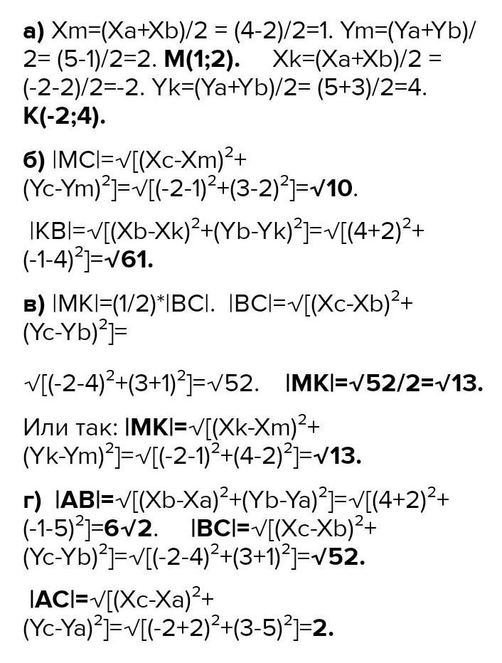 Дан треугольник ABC, точки A(-5;-2),B(-4;1),С(2;-3),точка М - середина АВ, точка К - середина АС, найдите: