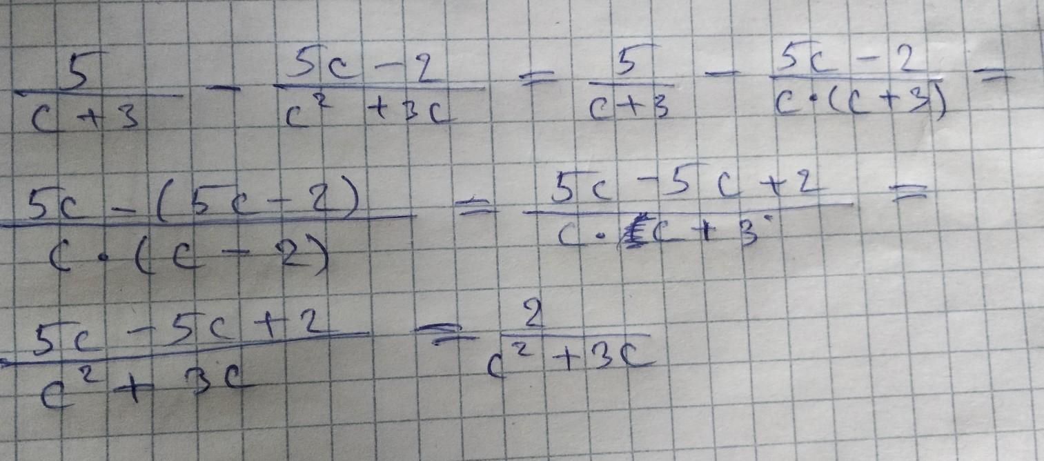 5/(c+3) - (5c-2)/c(c+3)=(5c-5c+2)/c(c+3)=2/c(c+3).
