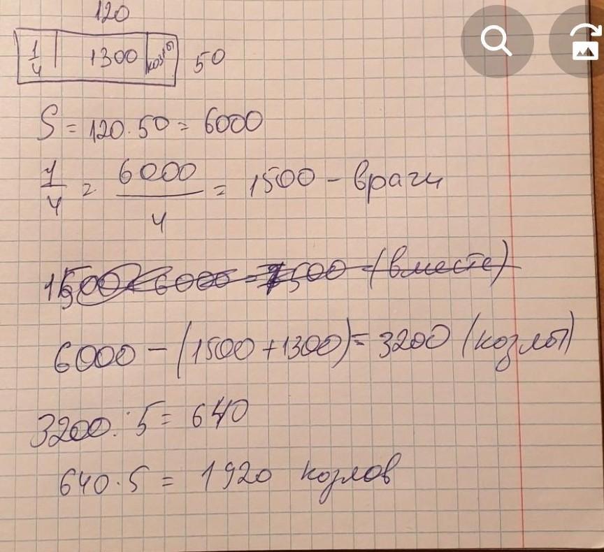 На прямоугольном поле брани, длина одной стороны которого 120м, а длина другой 50м, стоят наши и враги. Враги занимают четвертую часть площади поля брани, а ниша занимают 1300 м2. На остальной части поля брани пасутся козлы, по 3 козла на каждые 5 м2. Сколько козлов пасется на поле брани?