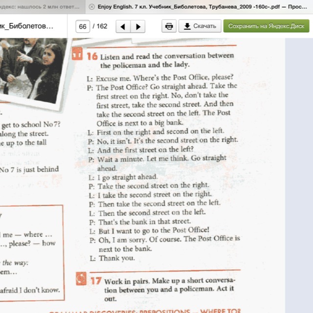 P: Почтовое отделение? Идите вперед. На первой улице поверните направо. Ой, не на первой, а на второй улице. И потом поверните на второй улице налево. Почтовое отделение находится рядом с большим банком.