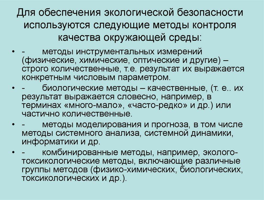 Экологическая безопасность - это способность противостоять угрозам по отношению к жизни, здоровью, источникам жизнеобеспечения и ресурсам. Об экологической безопасности можно говорить применительно к отдельному району, городу, региону, государству и планете в целом. Крупные экологические проблемы имеют межгосударственный характер, так как у природы нет границ. Обеспечение экологической безопасности в одном регионе или государстве имеет важное значение для любого другого региона и государства. А значит, достижение экологической безопасности – это международная задача, и здесь необходимо международное сотрудничество.
