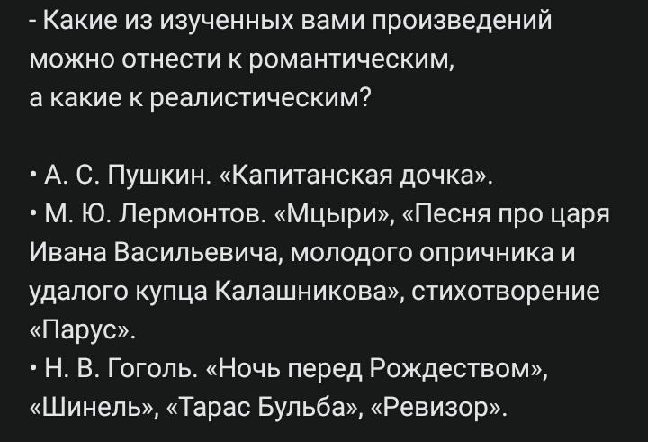 Романтические:Мцыри, Песня про купца калашникова, стих парус, Шинель, Тарас бульба.
