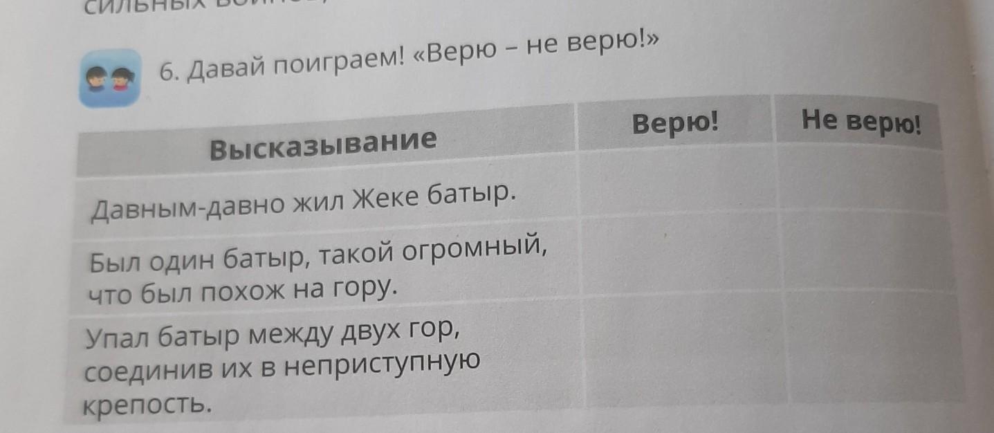- 6. Давай поиграем! «Верю - не верю!» Высказывание Верю! Не верю! Давным-давно жил Жеке батыр. Был один батыр, такой огромный, что был похож на гору. Упал батыр между двух гор, соединив ИХ В неприступную крепость.