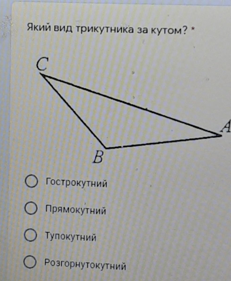 Який вид трикутника за кутом? * Гострокутний оПрямокутний ОТупокутний Розгорнутокутний