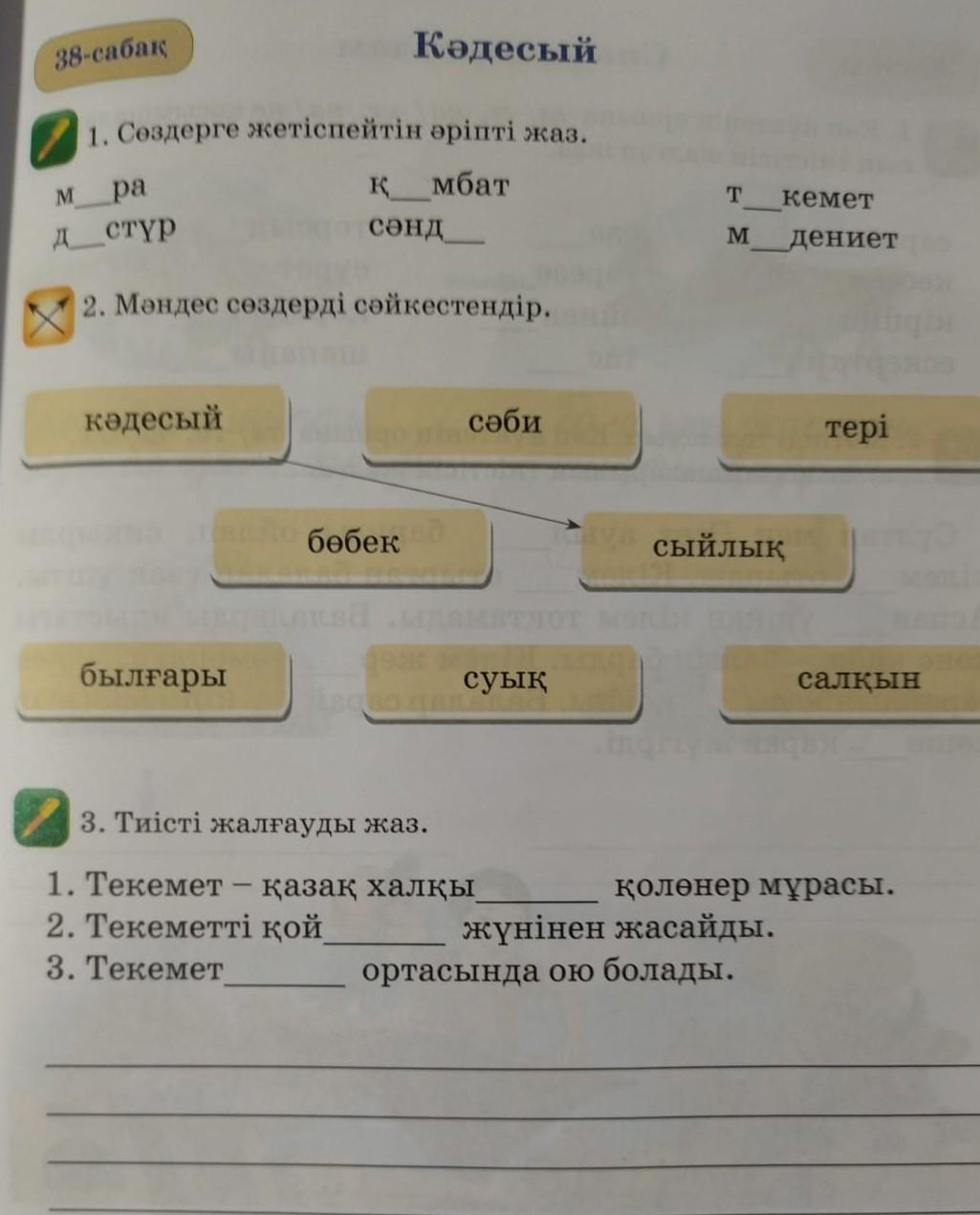 38-сабақ Кәдесый 1. Сөздерге жетіспейтін әріпті жаз. M ра д_стүр қмбат т кемет сәнд__ M дениет 2. Мәндес сөздерді сәйкестендір. кәдесый сәби тері бөбек сыйлық былғары суық салқын 3. Тиісті жалғауды жаз. 1. Текемет – қазақ халқы қолөнер мұрасы. жүнінен жасайды. ортасында ою болады. 2. Текеметті қой 3. Текемет 41