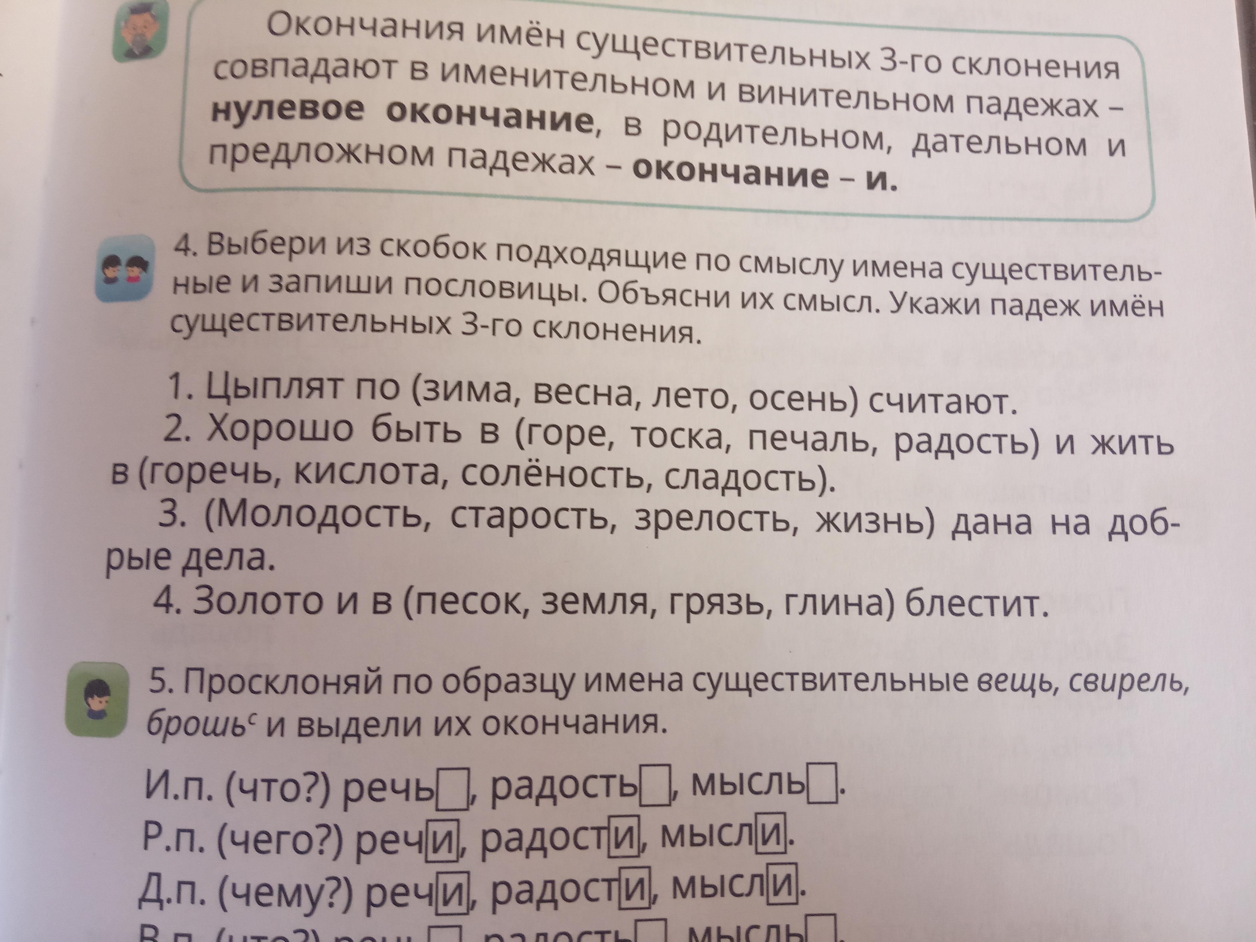 Помогите пожалуйста сделать задание номер 4 я очень плохо знаю склонения и пословицы