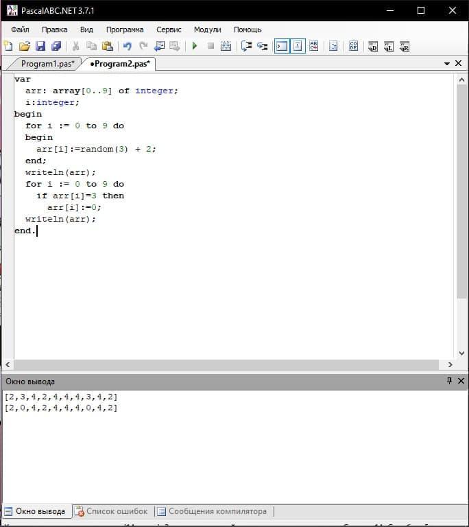 Заполнить с помощью генератора случайных чисел массив из 10 элементов числами от 2 до 5. Заменить в нем на 0 все элементы, равные 3
