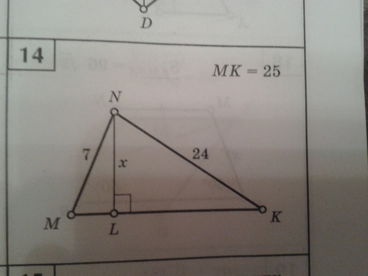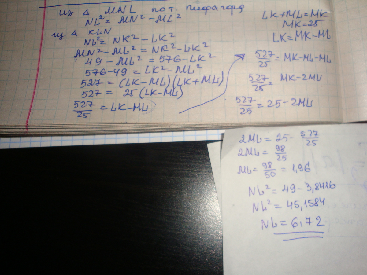 NL = MN * NK / MK = 7*24/25 = 6,72