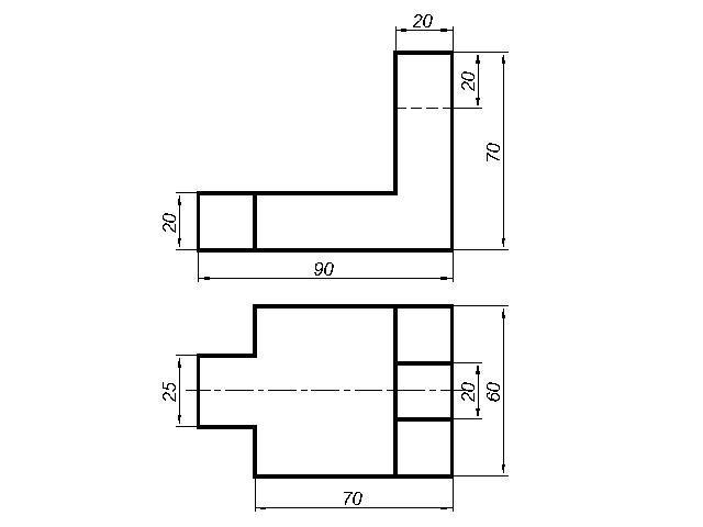 Начертите фронтальную проекцию предмета (рис. 66). Пользуясь наглядным изображением. постройте горизонтальную проекцию. Нанесите размеры.