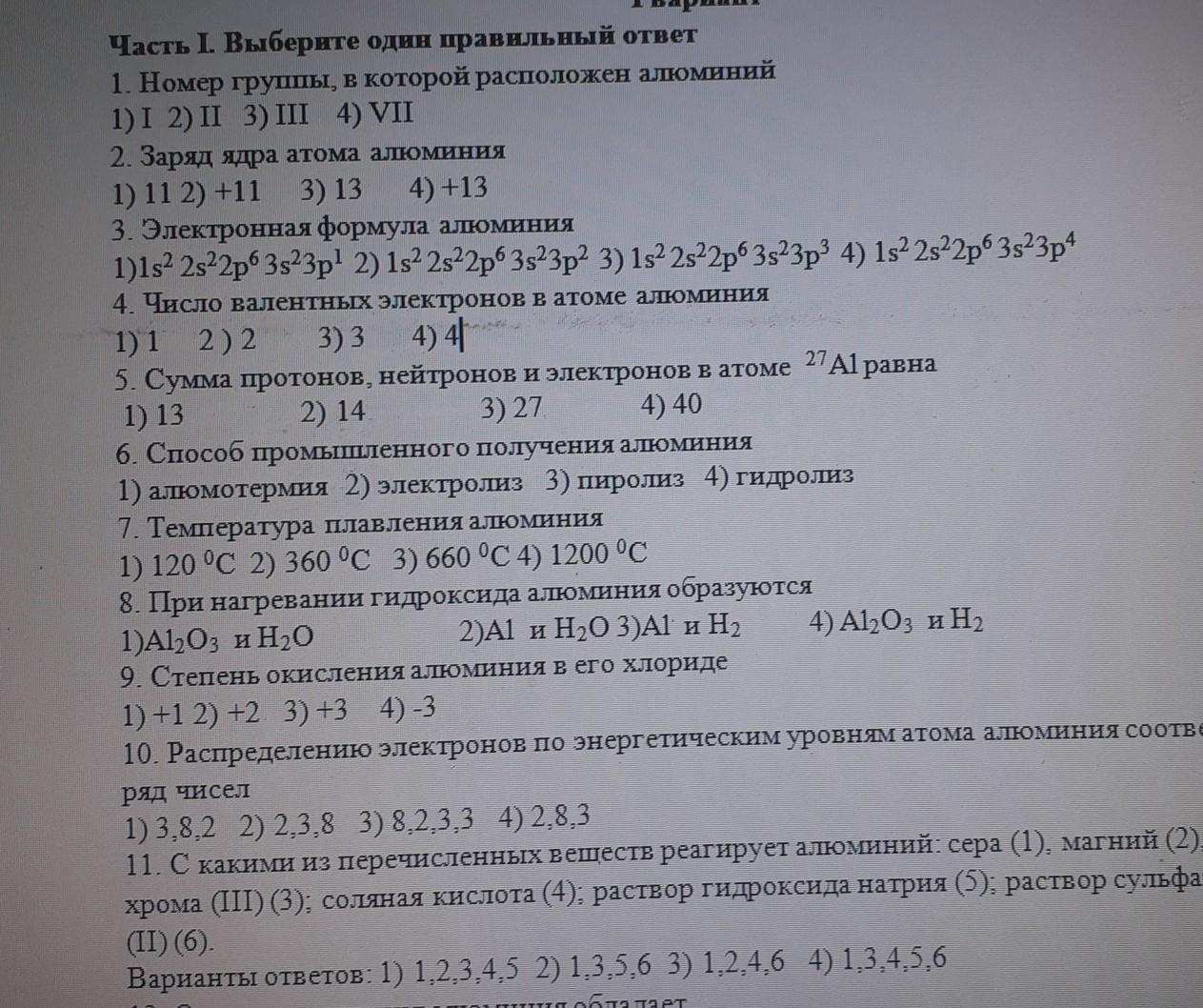 3) Электронная конфигурация алюминия 1s² 2s² 2p⁶ 3s² 3p¹. Ответ: 1