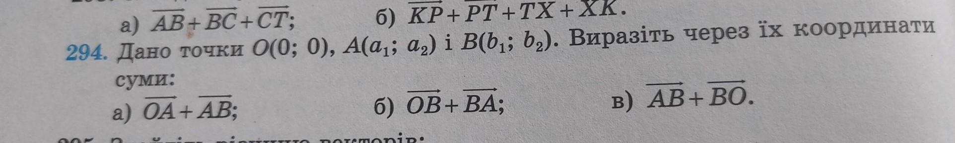 294 . Запишемо вектори:ОА = ( а₁ ; а₂ ), ОВ = ( b₁ ; b₂ ), AB = (b₁-a₁ ;b₂-a₂ ) .