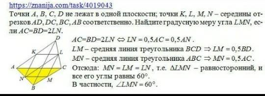 Точки A, B, C, D не лежать в одній площині; точки K, L, M, N — середини відрізків AD, DC,BC, AB відповідно.Знайдіть градусну міру кута LMN, якщо AC=BD, KL=LN
