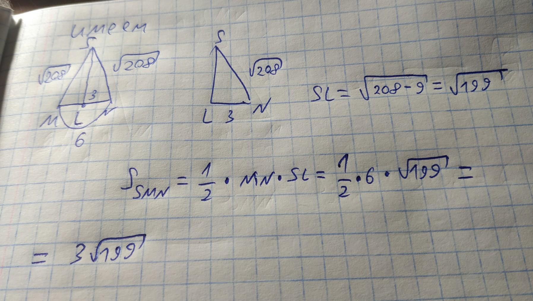 Высота: √(10^2 -(6/2)^2) = √(100 -9) = √91. S/√91 = 1/2 * 6 * √91/√91 = 3
