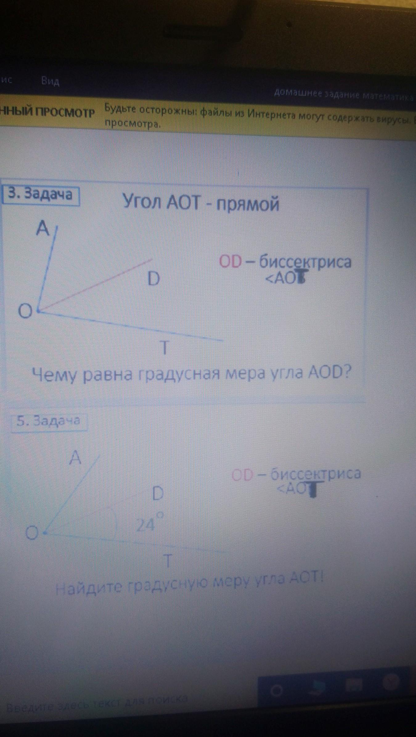 3. Задача Угол AOT - прямой A OD - биссектриса KAOT D О T Чему равна градусная мера угла AOD? 5. Задача А OD - биссектриса