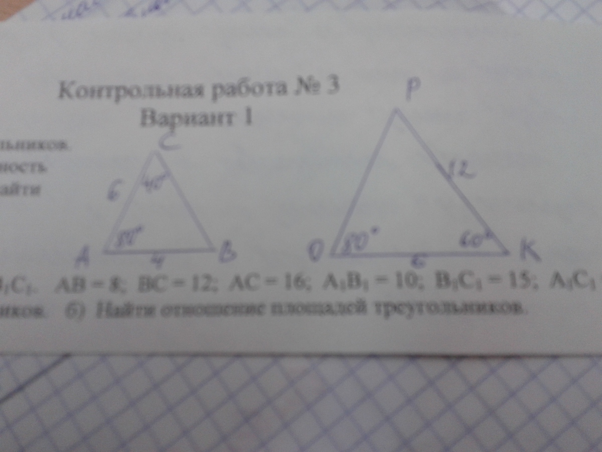 в начале нужно найти угол в. угол в=180град.-(80+40)=60 градусов-угол в. угол в=углу р=60 градусов; угол а=углу о=80градусов⇒Δавс≈Δорк.