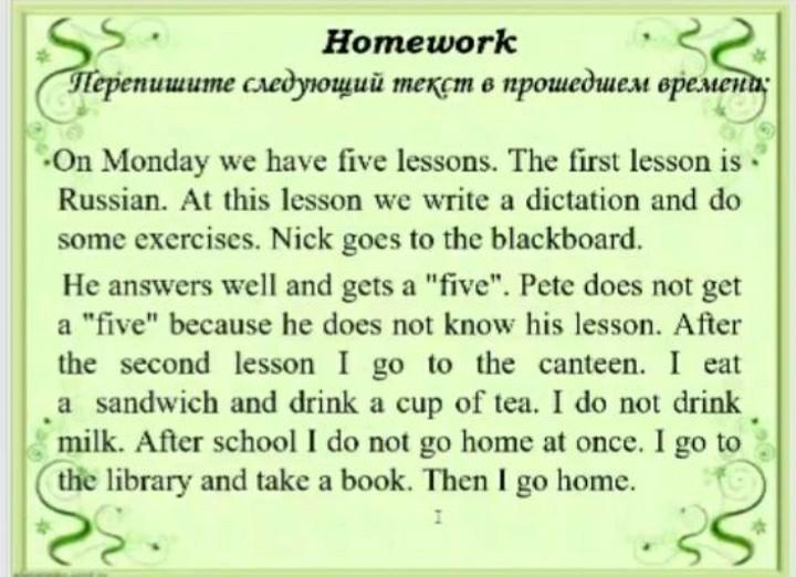 On Monday we had five lessons. The first lesson was Russian. At this lesson we wrote a dictation and did some exercises. Nick went to the blackboard.