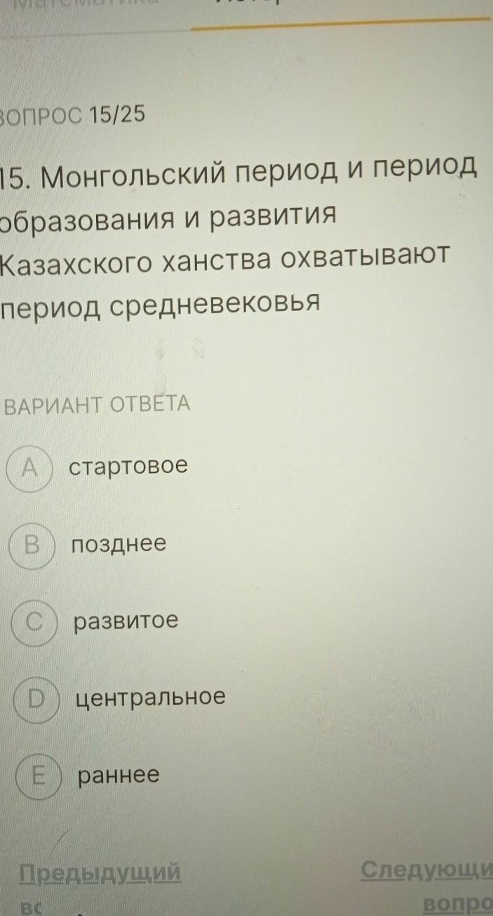 ВОПРОС 15/25 15. Монгольский период и период образования и развития Казахского ханства охватывают период средневековья ВАРИАНТ ОТВЕТА А стартовое В позднее развитое D) центральное Ераннее