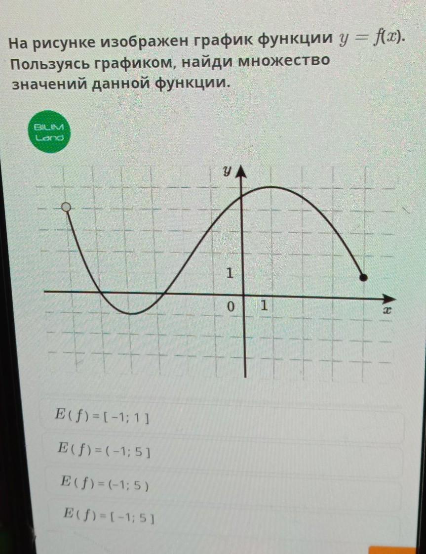 На рисунке изображен график функции y = f(x). Пользуясь графиком, найди множество значений данной функции.