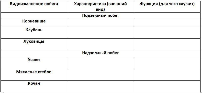 Заполните таблицу по видоизменениям побегов. Кратко напишите их функции и внешний вид.(пж срочно)!