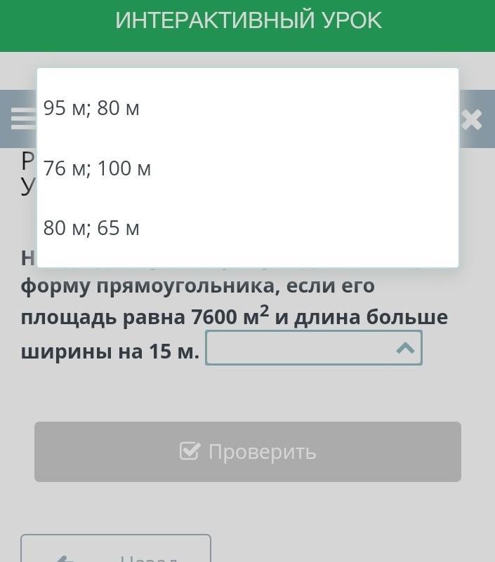 Найди длину и ширину сада, имеющего форму прямоугольника, если его площадь равна 7600 м2 и длина больше ширины на 15 м.
