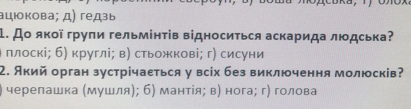 1)Аскари́да лю́дська (Ascaris lumbricoides) — паразитичний круглий черв.