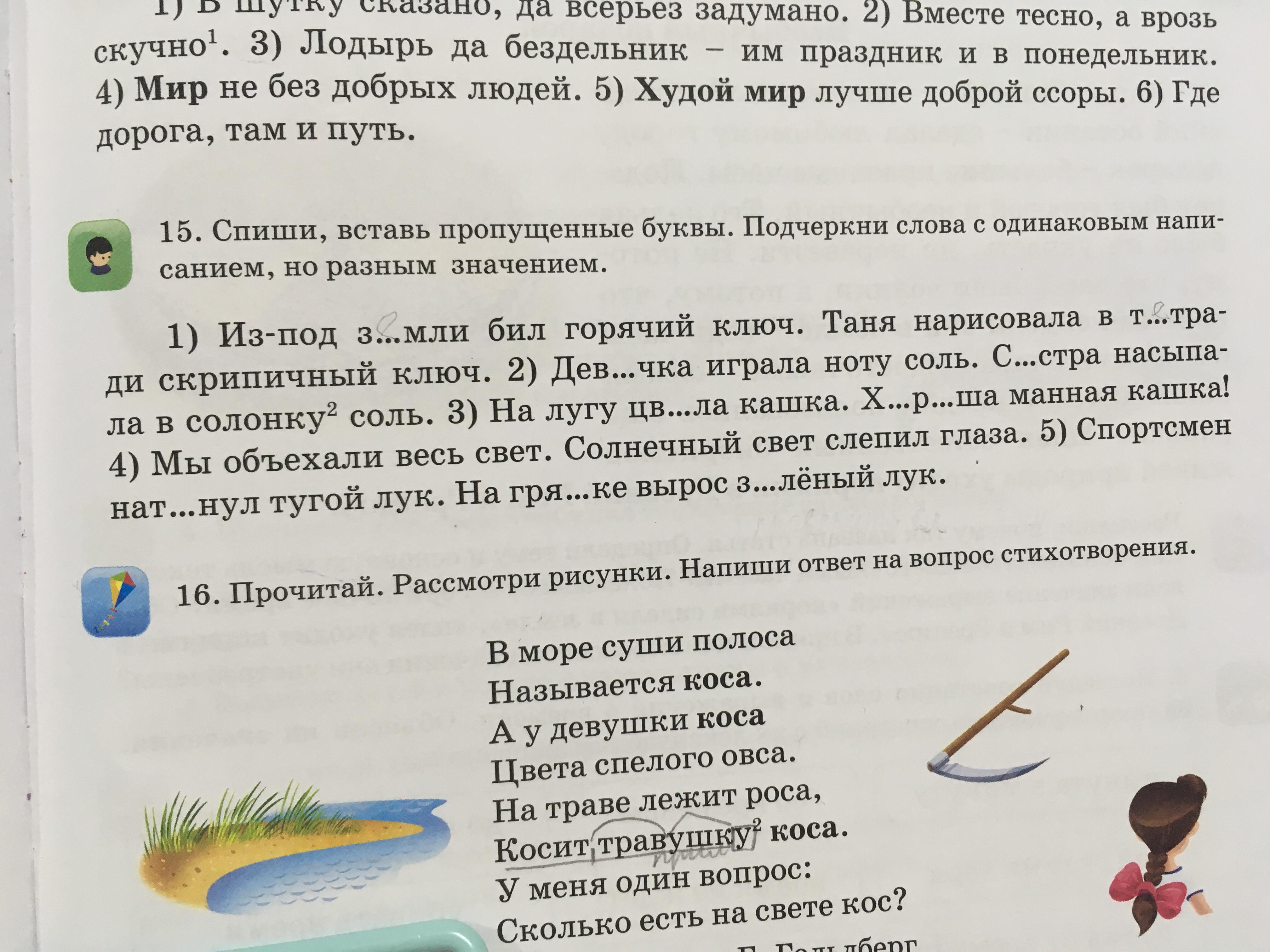 15. Спиши, вставь пропущенные буквы. Подчеркни слова с одинаковым написанием, но разным значением. + проверить как пишутся слова, например: земли(проверка)