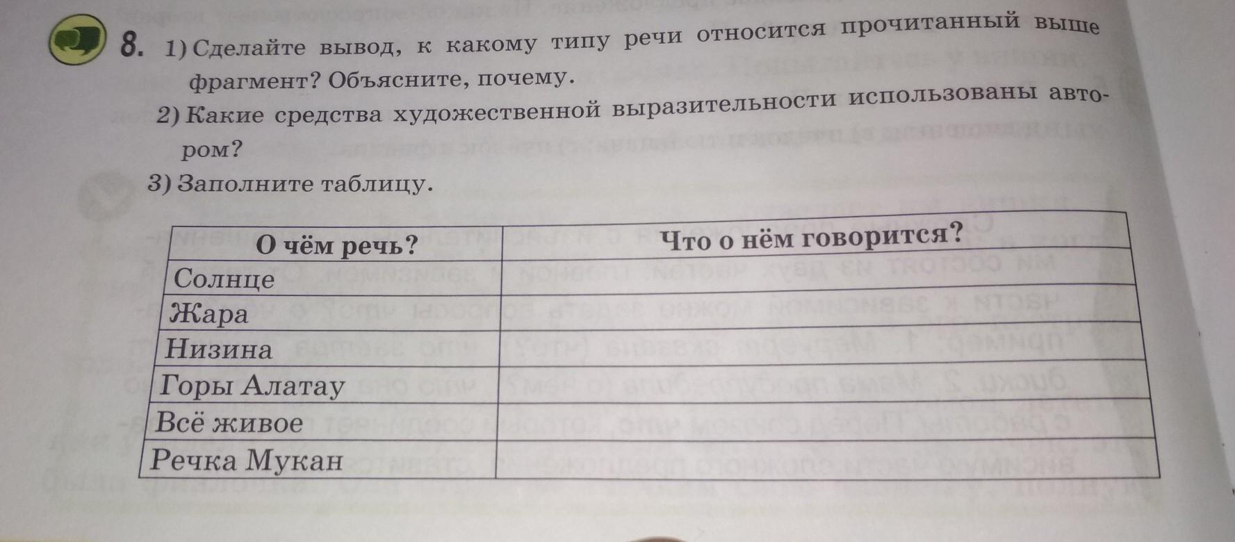8. 1) Сделайте вывод, к какому типу речи относится прочитанный выше фрагмент? Объясните, почему. 2) Какие средства художественной выразительности использованы авто- ром? 3) Заполните таблицу. Что о нём говорится? О чём речь? Солнце Жара Низина Горы Алатау Всё живое Речка Мукан