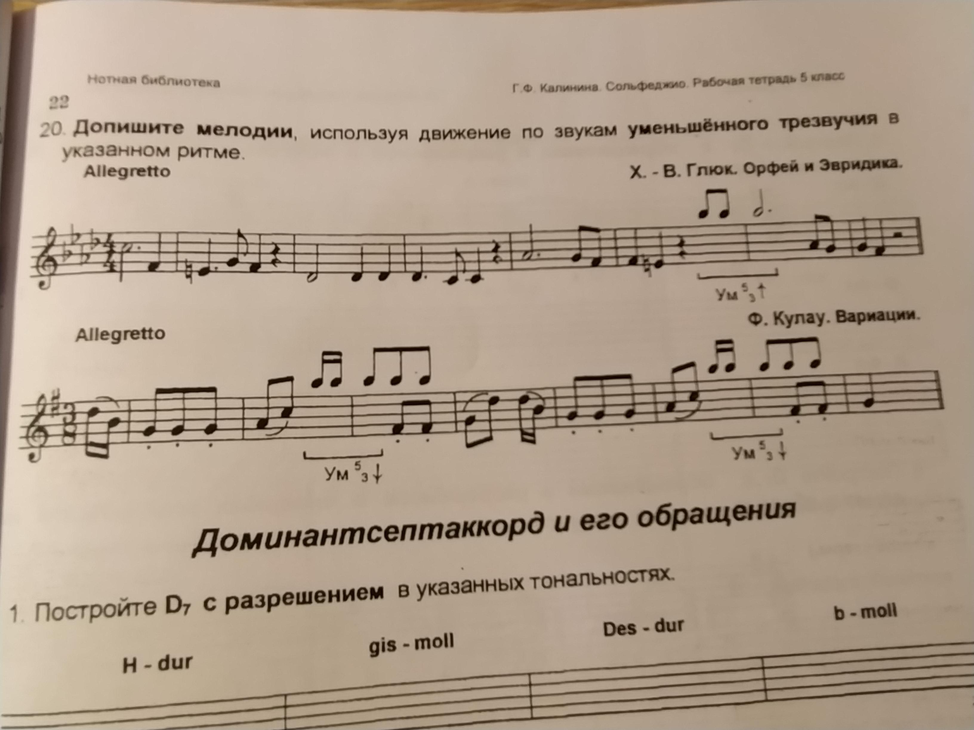 Допишите мелодии, используя движение по звукам уменьшённошо трезвучия в указанном ритме, по звукам Ум⅗