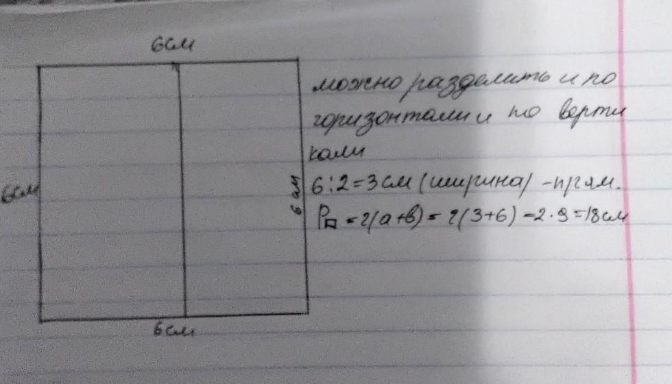 437.Квадрат со стороной 6 см разделен на два равных прямоугольника. Найдите периметр каждого прямоугольника.