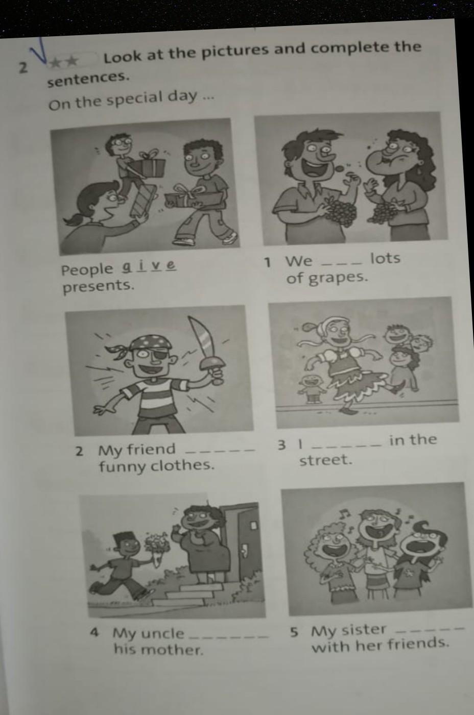 ** Look at the pictures and complete the sentences. On the special day... People give presents. 1 We lots of grapes. 2 My friend funny clothes. 31———— street. in the 4 My uncle his mother. 5 My sister with her friends.