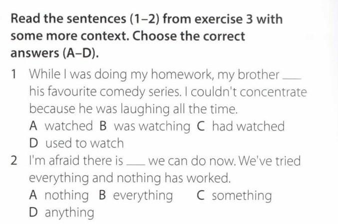 1 - b) was watching - потому что действие длилось одновременно, я делал домашнее задание, а брат смотрел комедию, и я не мог сосредоточиться, потому что он все время смеялся