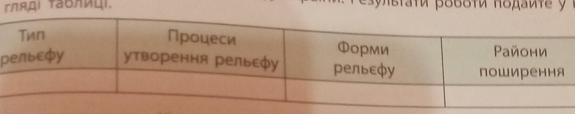 Тип рельєфу Процеси утворення рельєфу Форми рельєфу Райони поширення табличку заполните пж