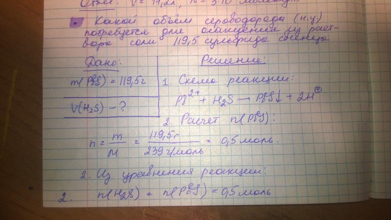 Какой объём сероводорода (при н. у.) потребуется для осаждения из раствора соли 119,5 г сульфида свинца?