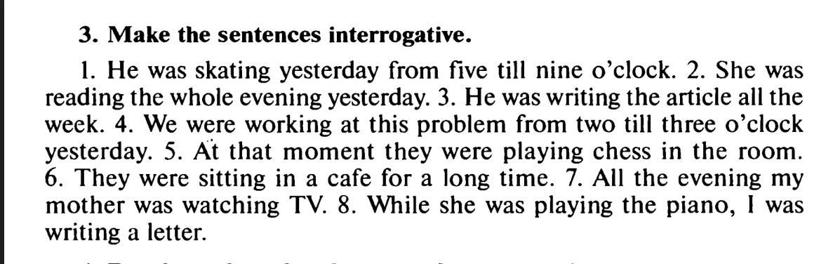 1. What time was he skating yesterday? 2. When was she reading the whole evening? 3. What was he writing all the week? 4. Who was working at this problem from two till three o'clock yesterday? 5. What were they playing in the room at that moment? 6. Where were they sitting for a long time? 7. What was my mother watching all the evening? 8. When were you writing a letter?