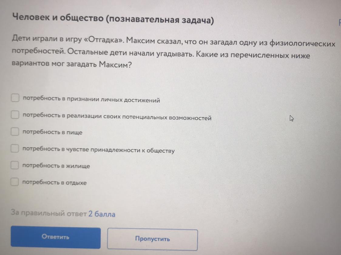 Дети играли в игру «Отгадка». Максим сказал, что он загадал одну из физиологических потребностей. Остальные дети начали угадывать. Какие из перечисленных ниже вариантов мог загадать Максим?