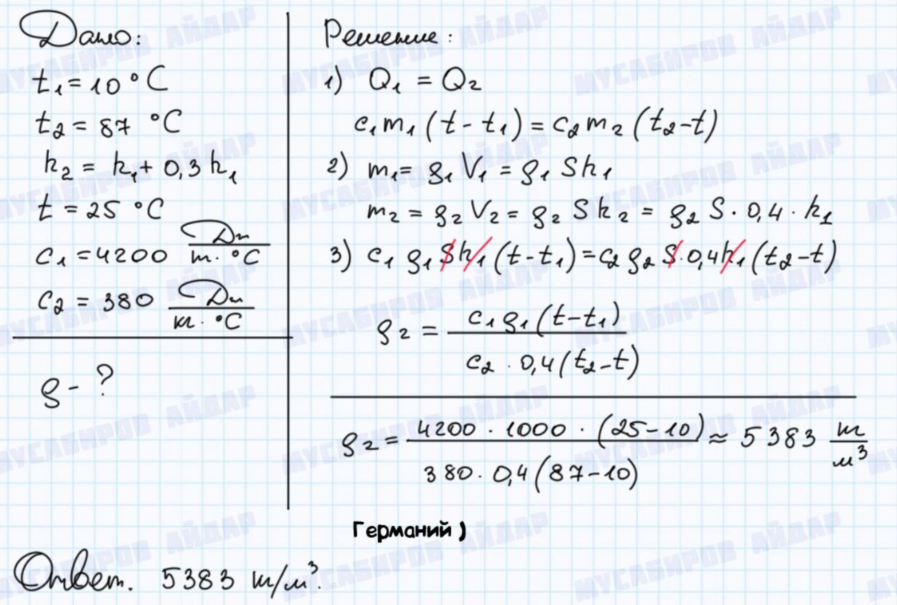 В бак с водой при температуре t1=10C положили медный брусок с температурой t2=87C и уровень воды вырос на 30%. После установления теплового равновесия температура в баке оказалась t3=25C. Определите плотность меди. Теплоемкость воды с1=4200, меди 380. Потери тепла и теплоемкость бака не учитывать.