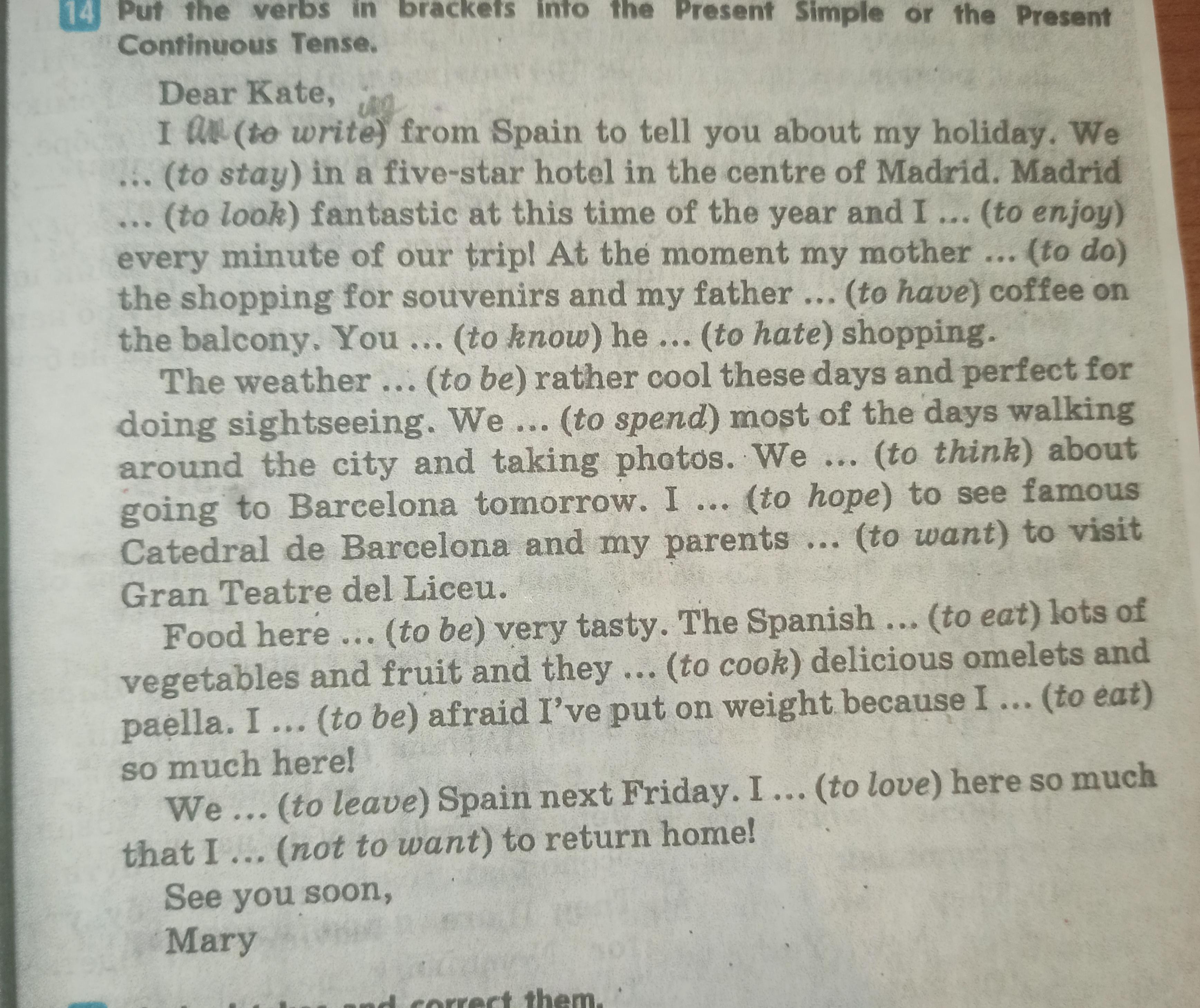 I am writing from Spain to tell you about my holiday. We are staying in a five-star hotel in the center of Madrid. Madrid looks fantastic at this time of the year and I am enjoying every minute of our trip! At the moment my mother is doing the shopping for souvenirs and my father is having coffee on the balcony. You know he hates shopping. The weather is rather cool these days and perfect for doing sightseeing. We spend most of the days walking around the city and taking photos. We think about going to Barcelona tomorrow. I hope to see the famous Catedral de Barcelona and my parents want to visit Gran Teatre del Liceu. The food here is very tasty. The Spanish eat lots of vegetables and fruit and they cook delicious omelets and paella. I am afraid I've put on weight because I eat so much here! We are leaving Spain next Friday. I love here so much that I want to return home!