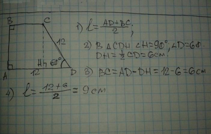 у прямокутній трапеції менша основа доривнює 3 см а більша сторона 8 гострий кут дорівнює 60 градусів визначте середню лінію трапеції