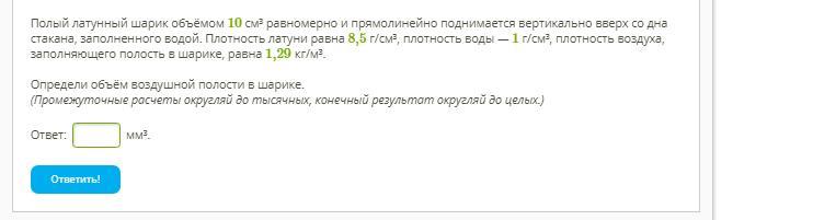 V1 = V(ρ(в)-ρ(л))/(ρ(возд)-ρ(л))= 10* (1-8.5)/(0.00129-8.5) = 8.825 см^3=8825 мм^3